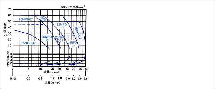50NPD40Z的(de)(de)(de)試(shi)制成(cheng)功又(you)擴大(da)了(le)此系列(lie)產(chan)品(pin)的(de)(de)(de)對(dui)應范圍,而且由于采用的(de)(de)(de)是2P電(dian)機(ji),泵的(de)(de)(de)體積和功耗比類似用途(tu)4P電(dian)機(ji)的(de)(de)(de)品(pin)種(zhong)減少很多。 40NPD40Z最大(da)流量:180升/分(fen)鐘(10立(li)方/小(xiao)時),最高(gao)揚程:50米(mi)(0.5Mpa) 具(ju)體用途(tu)請參考NPD系列(lie)產(chan)品(pin)信息。